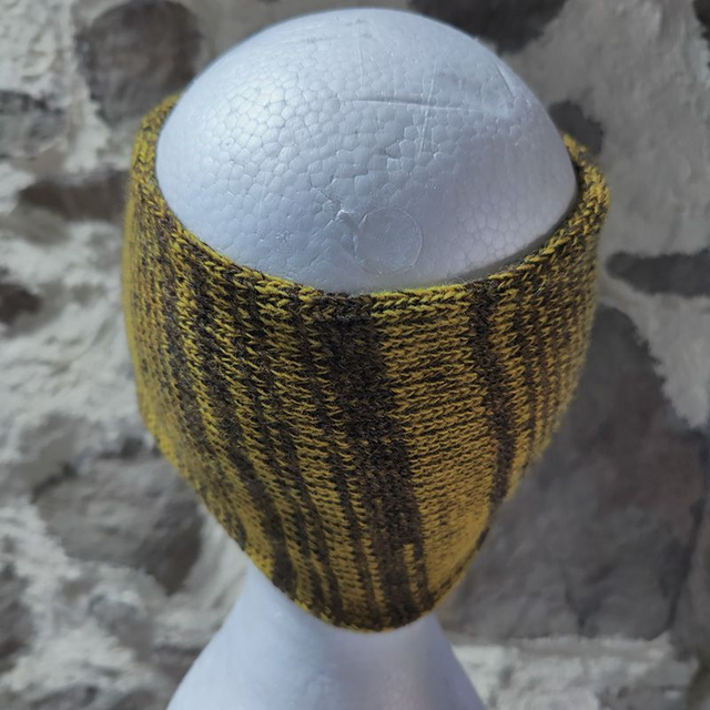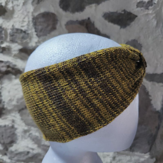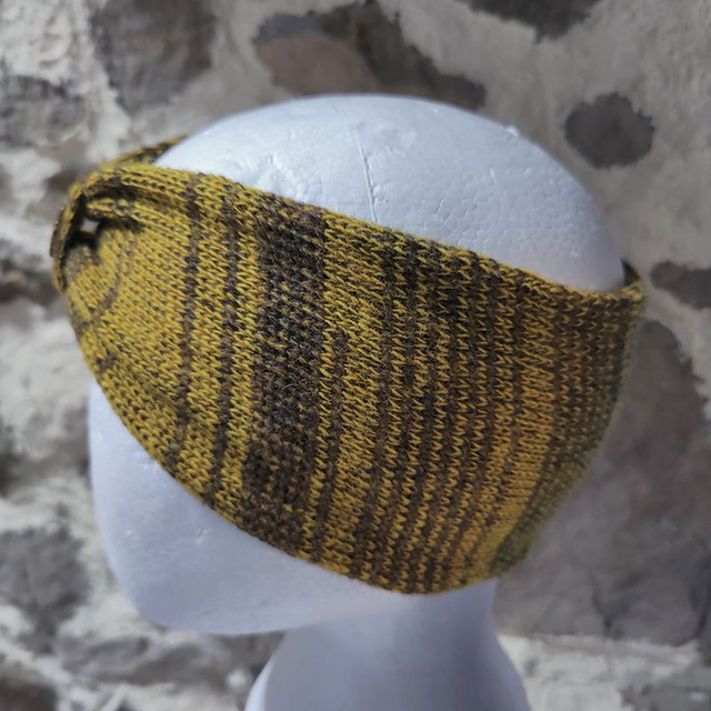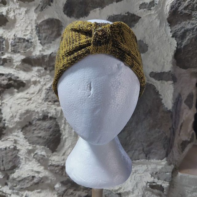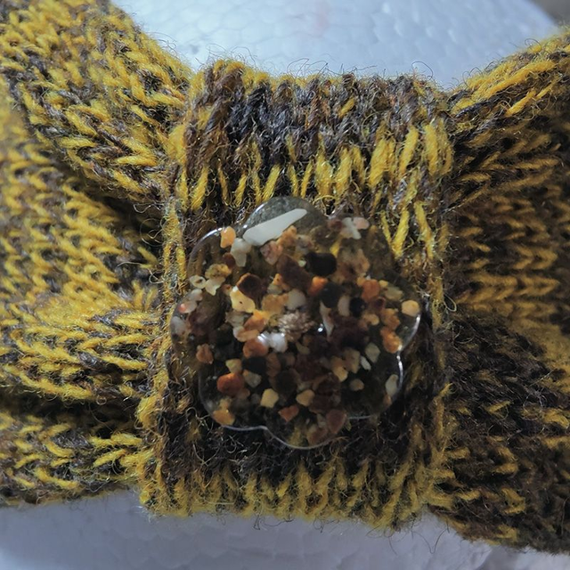 Couleurs autumn button headband is knitted with two different colours mustard and brown, creating a random stripe. There won't be two the same. Decorated with one of my unique handcrafted resin and sand buttons.