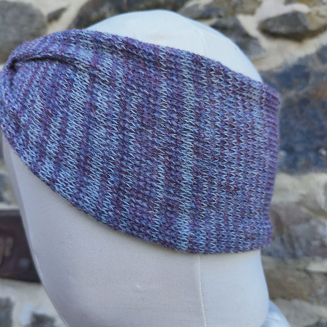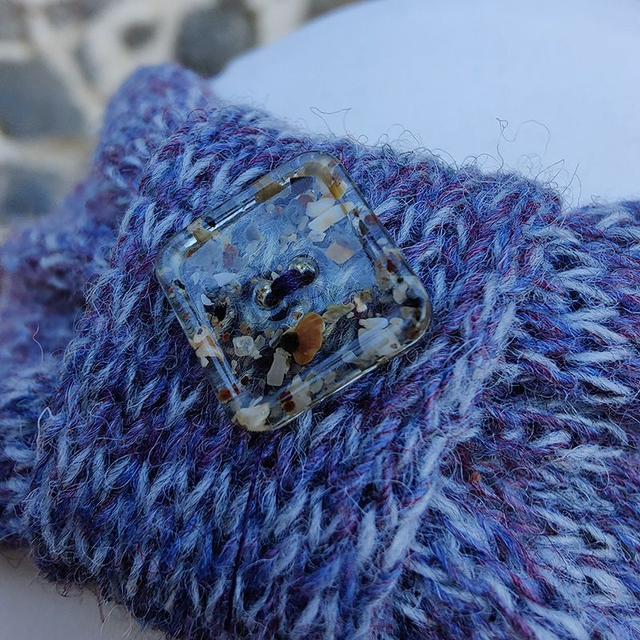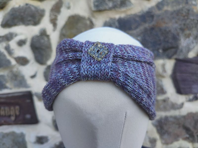 Torridon Collection Heather button headband is knitted with two different colours lilac and heather, creating a random stripe. There won't be two the same. Decorated with one of my unique handcrafted resin and sand buttons.
