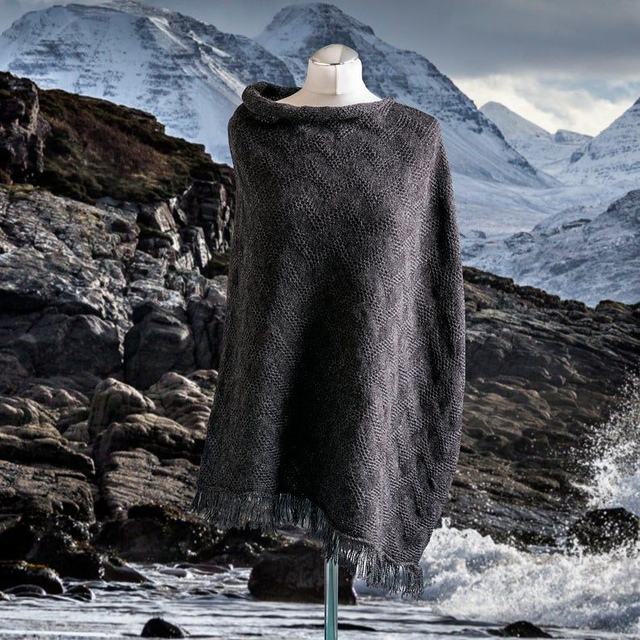 Seashore Textured waves asymmetric poncho knitted in a super soft Merino Wool and finished with a fringe. This stylish poncho is so comfortable to wear, great with jeans and a t-shirt or dressed up for an occassion. A versatile piece for your wardrobe.