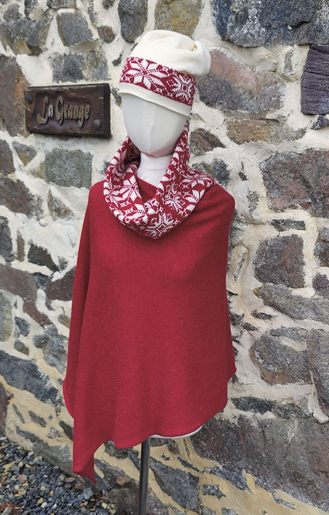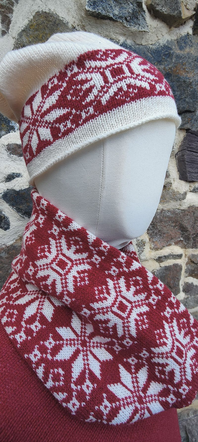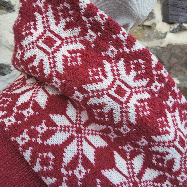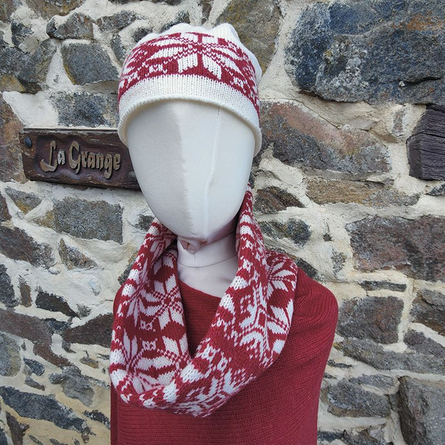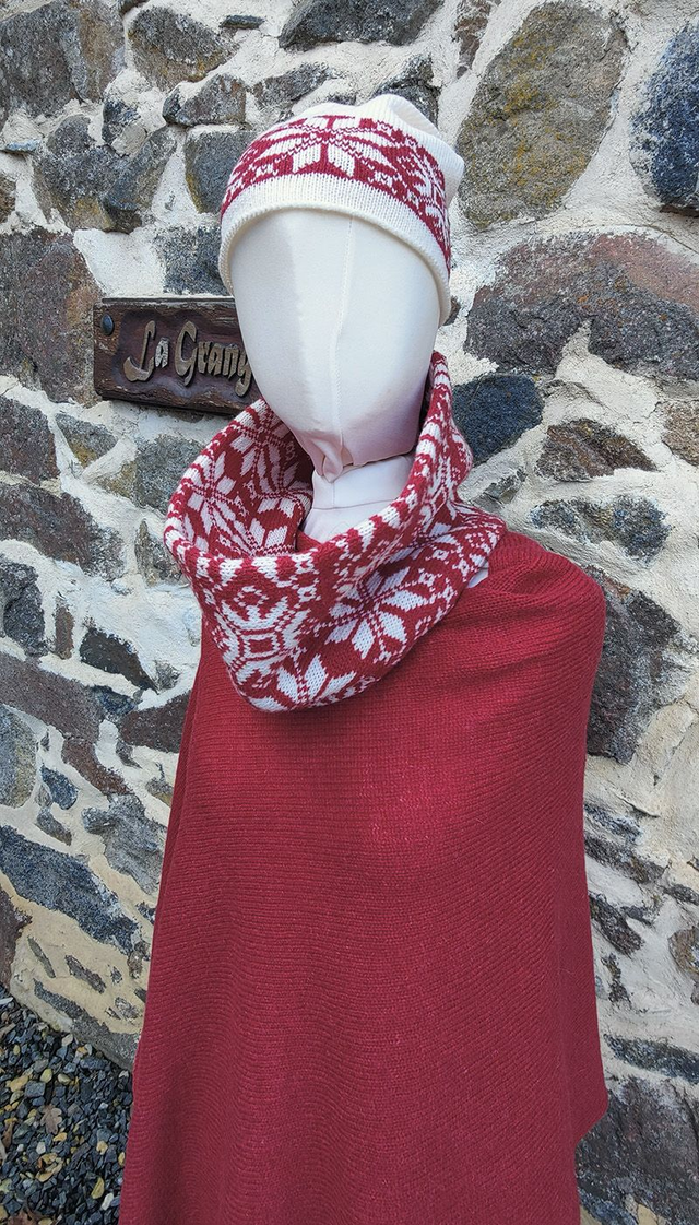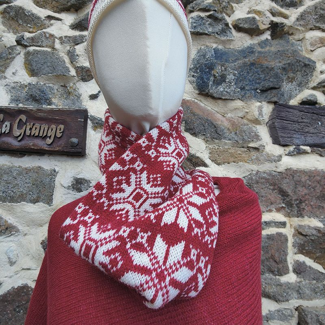 A snowflake patterned cowl knitted in raspberry red and winter white super soft lambswool spun in Scotland. This unisex cowl is doubled over, making it really comfortable and snuggly for winter. Great for those days outside on the ski slopes or just going for a walk.